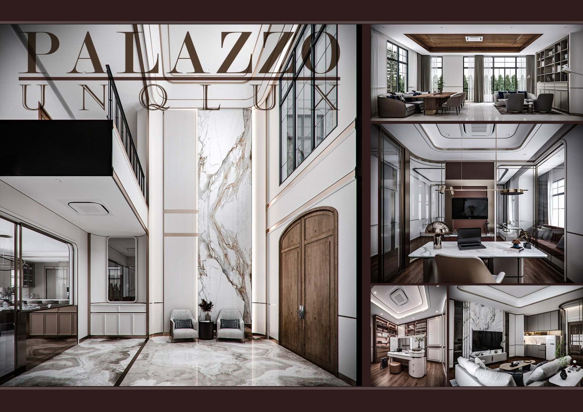 พามาชมโครงใหม่ เป็นโครงการบ้านพักอาศัย 2 ชั้นจากทาง ap โครงการ PALAZZO โดยที่ตอนนี้อยู่ในขั้นตอนเตรียมดำเนินงานก่อสร้างครับ ตัวโครงการรองรับครอบครัวขนาดใหญ่ มีห้องนอนทั้งหมด 4 ห้องนอน และพื้นที่ common area ของบ้านก็มีอย่างครบครัน สำหรับตัว concept หลักที่ใช้ในงานตกแต่งคือเน้นความสวยงามหรูหราที่เป็นเอกลักษณ์เฉพาะ ของเจ้าของบ้าน โดยทุกขั้นตอนของงานออกแบบ เรามีการ ลง detail แต่ในละส่วนอย่างตั้งใจ เพื่อให้งานออกมาสมบูรณ์แบบอย่างเป็นธรรมชาติที่สุดครับ 1st floor | common area เริ่มต้นที่โถงทางเข้าหลักของบ้าน เรามีการเปลี่ยนพื้นใหม่โดยใช้ลายหิน onyx ขนาดใหญ่เข้ามาใช้ในงานตกแต่งเผื่อให้ได้ความหรูหรา ที่เป็นลักษณะเฉพาะ ของบ้าน ผนังตกแต่งแต่งด้านขวา ขนาดใหญ่ใช้ pattern หินอ่อนที่สวยงามผสมผสานกับ detail และ design ที่ modern ได้อย่างลงตัว ตัวงานออกแบบเราตั้งใจให้มี detail ที่เชื่อมต่อ ในทุกๆด้านของห้อง มีการใช้ stainless สีทองเข้ามาใช้ได้อย่างเหมาะสม ไม่มาก และไม่น้อยจนเกินไปเพื่อให้งานได้ส่วนผสมของ ความ modern และ luxury ที่ดูแล้วไม่รู้สึกเกร็งจากความสะท้อนมากจนเกินพอดี ห้องทางด้านซ้ายมือเรากันพื้นที่ขึ้นมา โดยทำเป็นประตู aluminium สีทองที่มีการออกแบบใหม่เฉพาะของบ้านอีกเช่นกัน สำหรับห้องนี้นั้นตั้งใจออกแบบให้เป็นห้อง library room ใช้เป็นห้องทำงานรวมของคนในบ้านได้ เป็นห้องรับแขกที่เป็นทางการได้ งานออกแบบตั้งใจให้มีความโปร่งสบายจากช่องแสงเดิมของบ้าน ตัวผนังตกแต่งสีขาวผิวด้าน เดินคิ้ว สีเหลี่ยมเข้ามุม 45องศา ให้ detail แบบ neo classic ที่มีความทันสมัยมากขึ้นไม่ได้เป็นบัวใหญ่ซับซ้อน เหมือน classic ยุคก่อน ตัวฝ้าเพดานใช้ไม้ข้ามาช่วยให้พื้นที่ดูมีความรู้สุกที่ concentration มากขึ้น แต่ก็มีการตกแต่งด้วย prop ที่ดู relax อย่างหมอน ,ต้นไม้ ,floor lamp หรือแม้แต่มุม ของโต๊ะประชุมที่มีขอบโค้ง เป็นต้น เมื่อออกมาจากห้อง กลับเข้ามาที่โถงทางเข้า แล้วเดินตรงเข้ามาก็จะเข้าสู่พื้นที่ ที่เป็นพื้นที่พักผ่อนของคนในบ้านครับ เนื่องด้วยตัว space ที่ทางโครงการจัดไว้นั้น เป็นแบบ open plan ซึ่งก็ดีมากๆ ทำให้พื้นที่ส่วนกลางจะดูโปร่งโล่ง และเชื่อมต่อการใช้งานได้อย่างต่อเนื่อง เป็นอันหนึ่งอันเดียวกัน สำหรับตรงส่วนนี้นั้น เราเน้นงานออกแบบที่ดู modern เป็นหลัก ไม่ได้เน้น ให้รู้สึกแน่น หรือจริงๆจังมากจนเกินไป ตัวตู้ tv เน้นงานออกที่ดูทันสมัยใช้ stainless สีทองเป็นซุ้มสำหรับทำเป็นชั้นวางของซ่อนไฟ ตรงกลางที่ติดตั้ง tv ใช้เป็นหินอ่อนสีขาว เน้น patten ที่ไม่ได้ดูโดดเด่นมากนัก มองแล้วสบายตา ด้านล่างก็ตกแต่งเป็นหินอ่อนสีดำ เชื่อมงาน design ยาวต่อเนื่อ