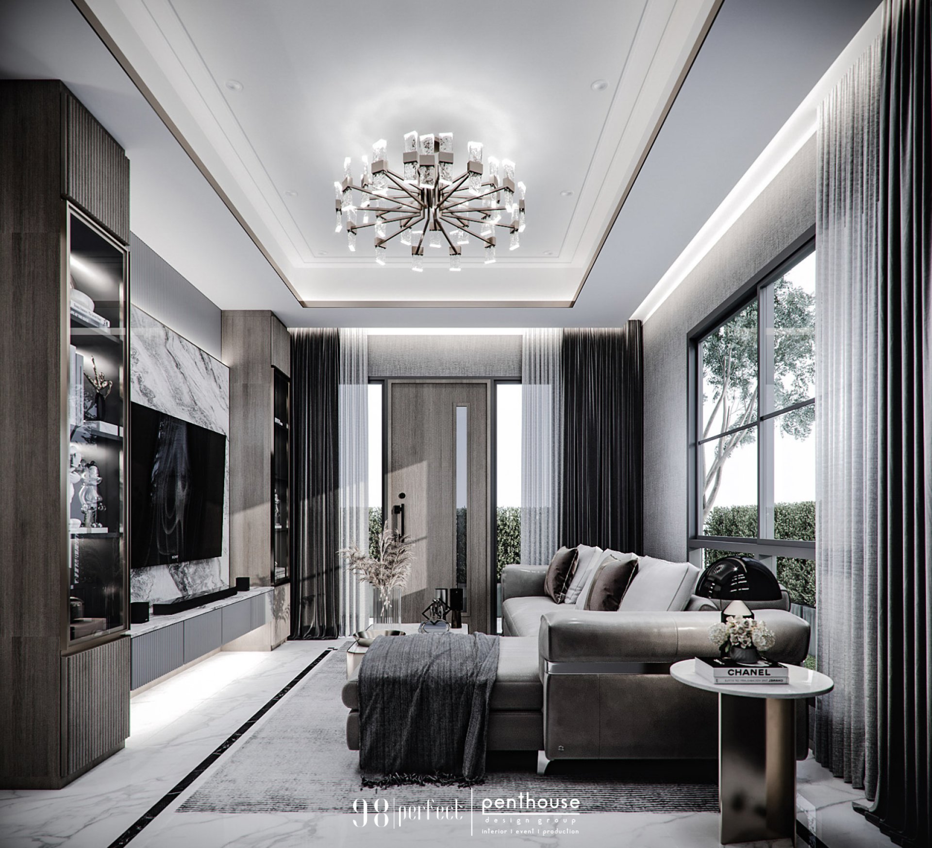 โครงการใหม่ที่ทางเราเพิ่งจบแบบ final design กันไปครับ เป็นโครงการบ้านจัดสรรของทาง Property Perfect โดยที่ตัวโครงการนี้นี้ จะมีส่วนที่ทางเราออกแบบอยู่ที่ 110 ตร.ม. ซึ่งเป็นพื้นที่ หลักของบ้านทั้งหมด ทั้งชั้น 1 และชั้น 2 ครับ งานออกแบบเน้น style modern luxury เป็นหลัก ชั้น 1 เริ่มต้นที่ห้องนั่งเล่นเมื่อเปิดประตูเข้ามา ด้วยความที่พื้นที่ไม่ได้เยอะมาก และฝ้าเพดานที่ไม่สูงมากนัก ทางเราจึงมีการปรับความสูงฝ้าเพดานใหม่โดยการ drop ฝ้าตรงกลางห้อง และตกแต่งด้วย stainless สีทองเพิ่มมิติ และความหรูหรามากขึ้น ตู้ทีวีมีการตกแต่งด้วยผนังหินอ่อน และตกแต่งด้วยไฟซ่อนทั้งด้านบนและด้านล่างตู้ และมีการแบ่งตู้โชว์ซ้ายและขวา ให้มีหน้าบานเป็นกระจกใส สามารถเก็บของโชว์ได้และไม่เก็บฝุ่นอีกด้วย เมื่อมองตรงมาด้านใน เราเพิ่มตู้เก็บของและตู้โชว์อีก 1จุด ให้ลูกค้าอีกด้วยครับ เมื่อเดินถัดเข้าไปในพื้นที่ต่อไป จะเป็นส่วนรับประทานอาหาร และเป็นพื้นที่ทีเชื่อมต่อทางเข้า ที่มาจากที่จอดรถอีกหนึ่งทาง ระหว่างทางเชื่อมนั้นเราทำเป็นซุ้มผนังโค้ง ให้ความรู้สึกไม่แยกขาด จากกันมากนัก และยังรู้สึกถึงการเชื่อมต่อของพื้นที่อีกด้วย สำหรับพื้นที่รับประทานอาหารนั้น เราเพิ่มตู้ที่เป็น 2 function เป็นได้ทั้งโต๊ะ console ที่สามารถเก็บกุญแจรถ เก็บของทั่วไปได้ และสามารถเป็น counter pantry ที่เชื่อมต่อกันมาอีกด้วย ในส่วน pantry นั้น ได้ function การใช้งานเป็นตัว U ถึงแม้จะมีแบ่งช่องทางเข้าสำหรับเข้าครัวไทยไป แต่ยังให้ความรู้สึกถึงการใช้งาน แบบตัว U อยู่ โดยที่แบ่ง การใช้งานได้ทั้งส่วนเตรียมอาหาร และส่วนตู้โชว์ของด้านบนไปในตัว มีการจัดวางโต๊ะรับประทานอาหารเป็นแนวยาว วางได้ถึง 6 ที่นั่ง โดยที่ผนังอีกฝั่ง ยังสามารถทำ ตู้เก็บของได้อย่างลงตัว และเป็นเหมือนงานตกแต่ง เพื่อให้ภาพรวมของห้องดูสวยงามขึ้นอีกด้วยครับ สำหรับห้องนอนที่ชั้น 1 นั้นเรามีการปรับให้เป็นห้องทำงาน และเป็นห้องดูหนังไปในตัว สำหรับพื้นที่ทำงานเราทำเป็นโต๊ะ built ยาวพื้นให้ใช้งานได้อย่างเต็มที่ และด้านบนทำเป็นชั้นวางของโปร่ง เพื่อให้ช่องแสงจากหน้าต่างผ่านเข้ามาได้เหมือนเดิม และด้านข้างที่เป็นส่วนทึบก็ปรับให้เป็นตู้เต็มจากพื้นถึงฝ้าเพดาน สำหรับงานตกแต่งผนังในส่วนอื่น เน้น groove stainless สีทองตัดกับกระจกเงา เพิ่มลูกเล่น และมิติให้กับผนัง และ sofa ที่ใช้เป็น sofa bed ที่สามารถปรับเป็นเตียงนอนยืดขาได้ เวลาที่นอนดูหนัง ถึงแม้พื้นที่จะไม่มากนักแต่สามารถจัดสรรการใช้งานตามที่ลูกค้าต้องการได้อย่างลงตัว สำหรับทางเข้าอีกทางที่มาจากที่จอดรถนั้น 
