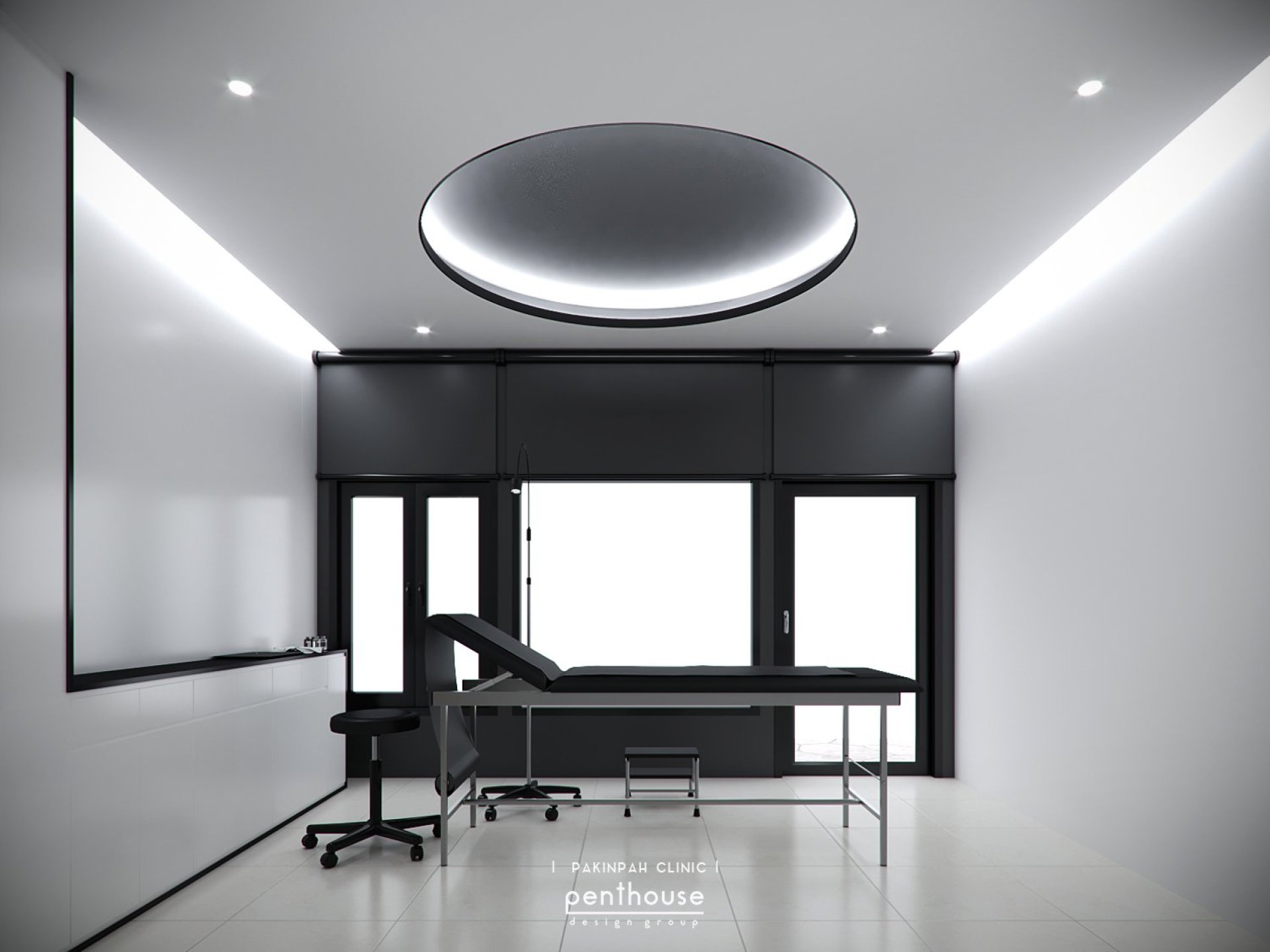 โครงการนี้ เป็นการนำเอาอาคารเก่ามา renovate ใหม่มีการกั้นพื้นที่และปรับเปลี่ยนรูปแบบให้เข้ากับงานออกแบบ อยู่ในงบประมาณที่จำกัด และสมเหตุสมผล โดย concept ค่อนข้างตรงไปตรงมาเลย มีการใช้โทนสี ขาวตัดกับดำ และแทรกด้วยสีของไม้เพียง 10-20% เท่านั้น งานออกแบบเป็น style minimal มากๆ ไม่เน้นอะไรที่หวือหวา หรือหรูหราใดๆ เริ่มต้นที่ส่วนต้อนรับ เราใช้ผนังซ้ายและขวาเป็นโทนสีดำ ตัดกับฝ้าเพดานและพื้นที่เป็นสีขาว เพื่อเน้นความสนใจไปที่ counter และ ผนัง ด้านหลังที่มี logo ของทางโครงการ ผนังด้านขวาหากสังเกตเราจะทำเป็นชั้นวางของ ซึ่งถอด design มาจาก logo ของโครงการด้วย ทำงานให้ออกแบบได้ทั้ง fuction การใช้งานและได้ทั้ง งาน sculpture ไปในตัว ตัวผนังสีดำลายไม้ จะเห็นมิติของลาย ให้ความรู้สึกเปรียบเสมือนเส้นผม เพื่อให้เข้ากับ concept ของงานอีกด้วยครับ ถัดมาจะเป็นทางเข้ามาด้านในซึ่งเป็นปรับตูบานเลื่อน ซ่อนอยู่ด้านหลังผนังตกแต่ง ประตูก่อนที่จะเข้าจะเป็นสีขาว แต่เมื่อเปิดเข้ามา ด้านในจะเห็นประตูห้องถัดไปเป็นสีดำ ซึ่งเป็นประตูของห้องผ่าตัด เมื่อมาถึงด้านในตกแต่งด้วยงานออกแบบที่ minimal ด้านบนเป็นฝ้า หลุมวงกลมสีดำ ซึ่งเป็นของเดิมที่มีอยู่แล้ว เรานำมาตกแต่งทำสีใหม่ให้เข้ากับโครงการ ภาพรวมยังคง concept และใช้รูปแบบของ สีที่ใช้เดียวกันกับ reception เนื่องจากห้องนี้พื้นที่เดิมจะไม่ได้เรียบ มีทั้งหน้าต่างที่หลายขนาด มีทั้งผนังที่่ยุบเข้าไป เราจึงใช้สีเข้ามา แก้ไขปัญหาทำให้ลดทอนความเยอะ ของพื้นที่และใช้ให้งานมีความ minimal ได้อย่างลงตัว