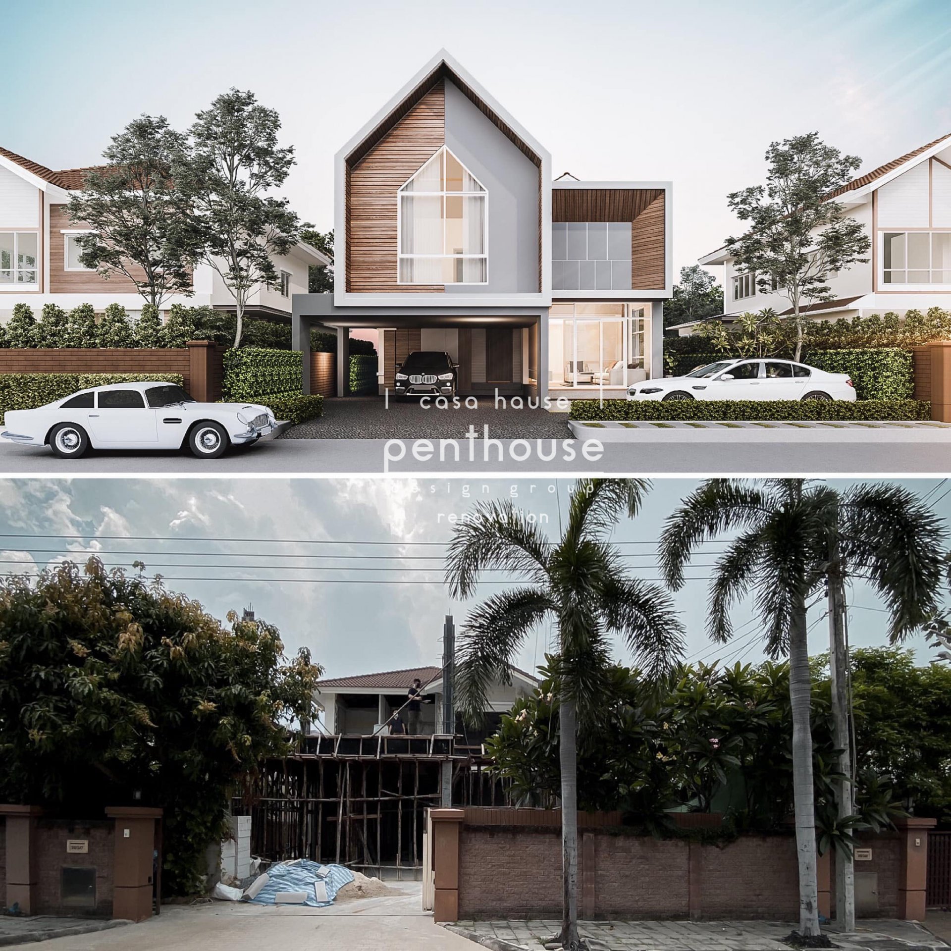 โครงการ ออกแบบปรับปรุงบ้านพักอาศัย 2 ชั้น ตัวบ้านเดิมมีอายุมากกว่า 7 ปี เป็นบ้านจัดสรร พื้นที่ก่อนต่อเติม อยู่ที่ประมาณ 180 ตร.ม. โดยตัวบ้านเดิมมีการวางรูปแบบ function เหมือนบ้านจัดสรรทั่วไป ทางเจ้าของมีความต้องการอยากเพิ่มเติมพื้นที่ใช้สอย และเพิ่มเติม function ใหม่เข้ามา รูปแบบของตัวภายนอกอาคารนั้นแต่เดิมเป็นรูปทรงตามยุคสมัยทั่วไป ทางเจ้าของอยากให้ปรับปรุงใหม่โดยต่อเติมส่วน ด้านหน้าบ้านให้มีห้องรับแขกใหม่ที่ชั้น1 และส่วนของห้องนอนใหญ่ที่ชั้น2เพิ่มเติม รูปแบบของงานออกแบบนั้นเน้นไปทาง scandinavian style บ้านแบบทรง nordic เป็นหลังคาทรงจั่ว แต่ลดรายละเอียดให้ดูร่วมสมัยมากขึ้น ใช้โทนสีที่ดูนุ่มนวล มีช่องเปิดที่เหมาะสมกับสภาพแวดล้อม และสภาพอากาศของประเทศไทย เข้ามาภายในบ้านเป็นส่วนของห้องรับแขก ที่เราต่อเติมขึ้นใหม่ โดยยกฝ้าเพดานโปร่งสูงให้ดูโล่งไปถึงชั้น 2เชื่อไปกับส่วนพื้นที่ family room ชั้น2 โดยทางเราได้ออกแบบให้ลูกค้าเลือกทั้งหมด 3option ตามความชอบและการใช้งานเป็นหลัก งานออกแบบใช้โทนสีที่สว่าง และนุ่มนวลและแทรกด้วย design ของคิ้วไม้ผสมผสานความ classic และ contemporary ที่ไม่ได้ทำให้ดู modern จนเกินไป