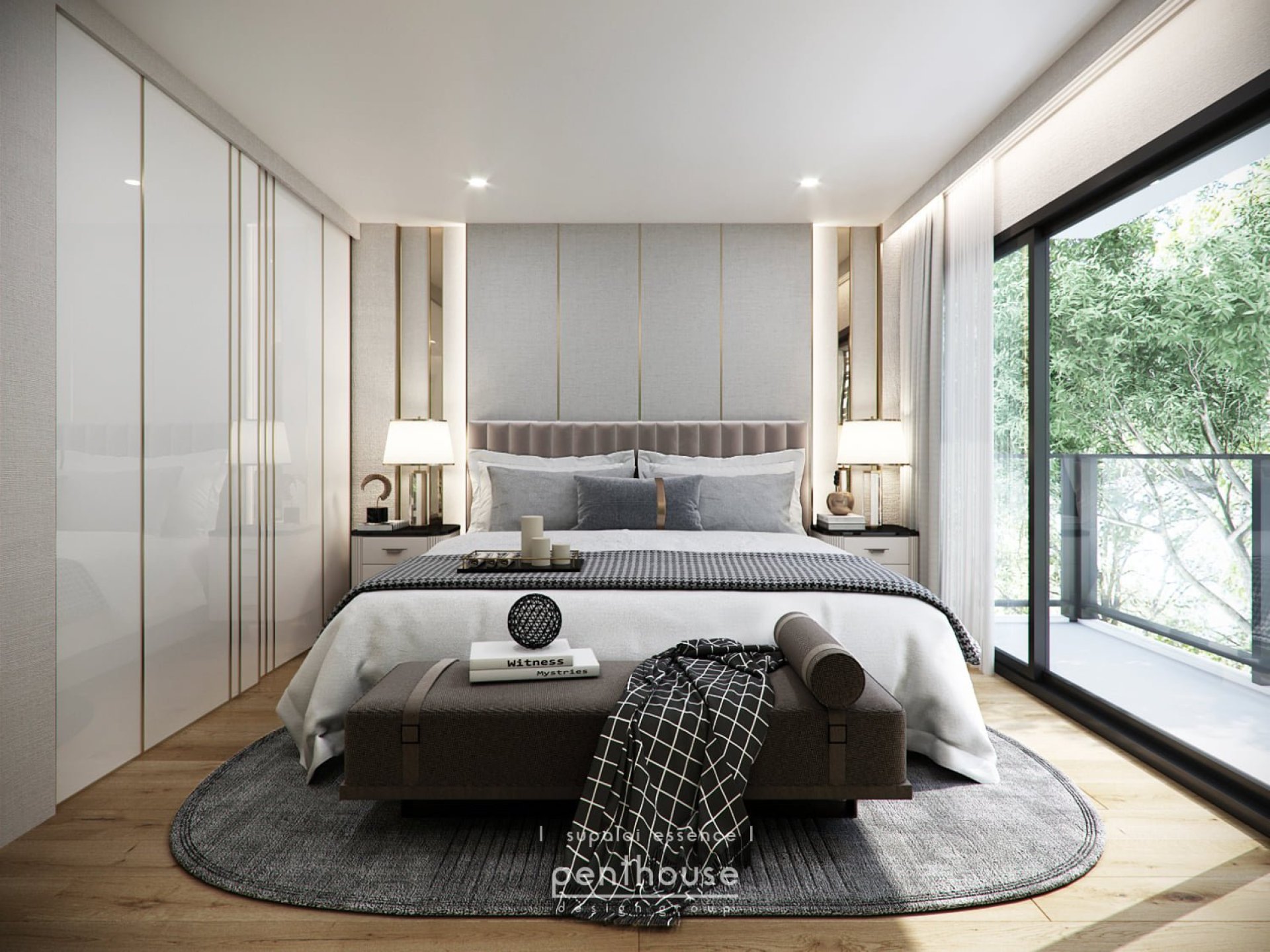 เริ่มต้นด้วยที่ ชั้น1 เป็นการจัดวาง function ตามรูปแบบของโครงการเลย จากทางเข้ามามีการออกแบบตู้รองเท้า ที่เป็นบานทึบผสมผสานไปกันชั้นวางของโชว์ ลบมุมโค้งเนื่องจากเป็นจุดที่เชื่อมกับทางเดิน เข้าสู่ห้องอเนกประสงค์ โดยออกแบบให้ดูไม่แหลมคม และซ่อนไฟโชว์ของได้อย่างลงตัว ในส่วนของ tv wall มีพื้นที่ไม่มากนักเราจึงเน้นตกแต่ง ในแนวสูงเป็นหลัก ตกแต่งด้วยหินอ่อนเล่น pattern แบบ bookmatch แสดงถึงความหรูหรา ด้านล่างเป็นตู้ลอยโค้งมนเรียบง่าย ฝ้าเพดาน ดรอปฝ้า เดินขอบทอง โค้งรับกับ design ซ่อนไฟเพิ่มความ สะอาดตามากยิ่งขึ้น ในส่วนของห้องนอนตกแต่งหัวเตียงด้วยโทนขาวลายผ้าตัดขอบทองซ่อนไฟ ด้านหลังซ่อนเป็นบานเลื่อน เปิดซ่อน เพื่อให้แสงเข้าจากหน้าต่าง ด้านข้างหัวนอนได้ ตามplan เดิมเลยจะมีพื้นที่ชื่อเป็นมุม แต่งตัวเล็กๆทางเราทำเป็นบานเลื่อนปิด เพื่อเป็นสัดส่วนมากยิ่งขึ้น ห้องแต่งตัวเรายกพื้นที่ทั้งห้องด้านหลังบ้าน มาทำเป็นห้องแต่งตัว ทำให้สามารถจัดสรรพื้นที่ได้อย่างเต็มที่ ตามการใช้งานของ เจ้าของบ้านได้เป็นอย่างดี ทั้งพื้นที่แต่งหน้า ตู้เก็บกระเป๋าโชว์ ตู้เสื้อผ้าที่แบ่งสัดส่วน ราวแขวนบน/แขวนล่าง ตู้เก็บของด้านใน ตามแต่การใช้งานของแต่ละบุคคลแต่งต่างกันไป ซึ่งตอบโจทย์ลูกค้าได้เป็นอย่างดี อีกหนึ่งห้องที่อยู่บนสุดของบ้าน ยกให้เป็นห้องทำงานสามารถ take view ได้อย่างสบายเนื่องจากอยู่ที่ความสูงชั้น 3 ของบ้าน การออกแบบ มีตู้ทั้งด้านหน้าและด้านหลัง แบ่งสัดส่วนตู้โชว์ตู้เก็บของได้อย่างครบถ้วน