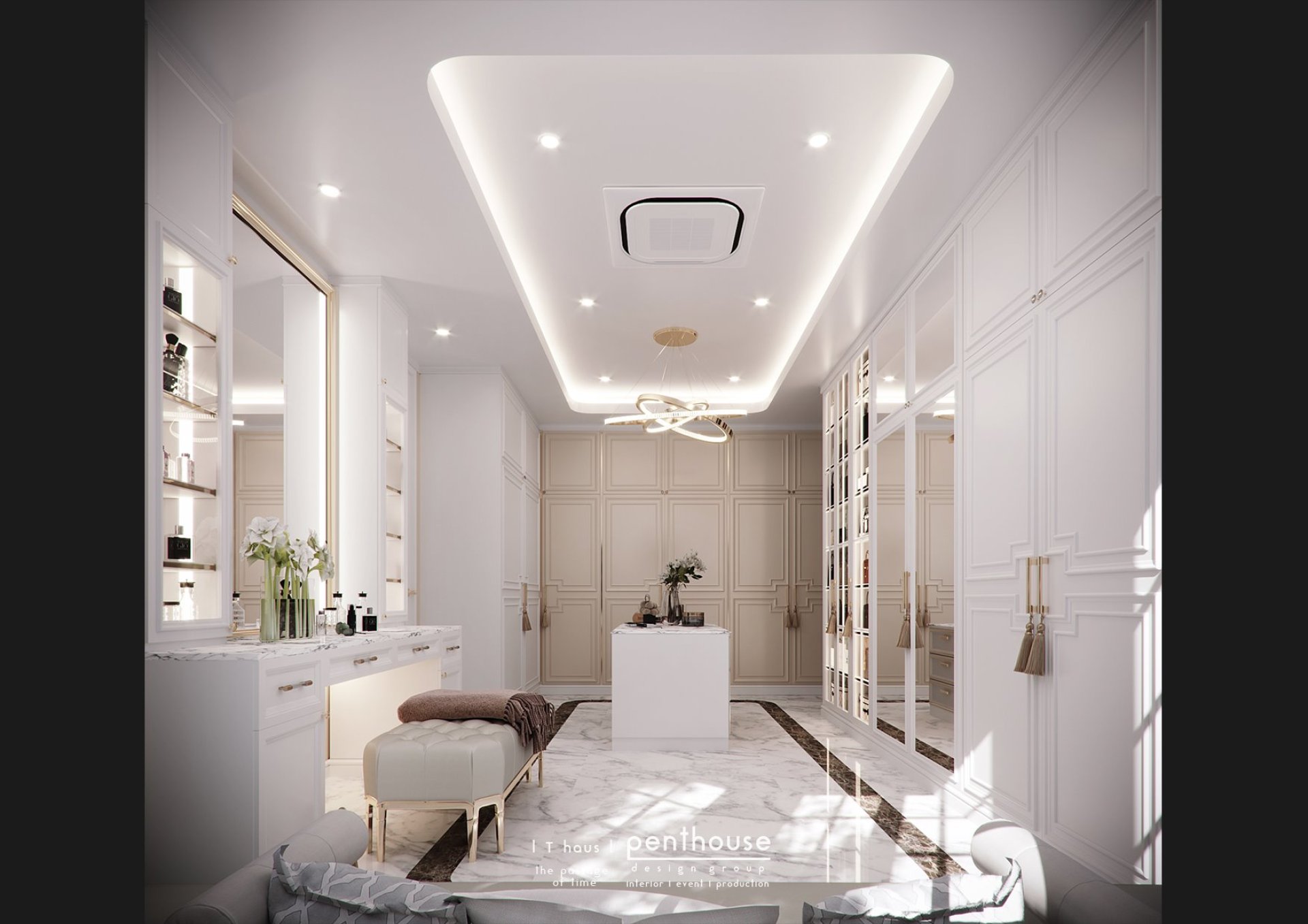 โครงการใหม่ของทางบริษัทเราที่พึ่ง final design เป็นอีกหนึ่งโครงการ renovate ที่น่าสนใจอย่างมากครับ โดยตัวโครงการเป็นบ้านชั้นเดียว ซึ่งพื้นที่ที่เราออกแบบนั้น เพียงแค่ส่วนหนึ่งของบ้านเท่านั้นครับ ตัวบ้านเดิมนั้นจะมีความเป็น classic ค่อนข้างสูง ทำให้เราเน้นงานออกแบบที่ผสมผสานความเป็น classic เดิมก่อนที่จะเชื่อมเข้าสู่ พื้นที่ที่ออกแบบใหม่ ให้มี กลิ่นอายของเดิมยังคงอยู่ พื้นที่ที่ออกแบบ จะมีโถงทางเดิน / พื้นที่รับแขก / และห้องทำงาน / ห้องนอนห้องแต่งตัว / และห้องน้ำ ครับ เริ่มต้นที่โถงทางเดินเพื่อเข้าสู่ห้องหลักของโครงการ ตัวโถงทางเดินเป็นทางเดินยาว หักเป็นตัว L โดยเราเปลี่ยนพื้นใหม่เป็นกระเบื้องลายหินอ่อนสีดำ black marquina ตัดกับตู้ สีขาวหน้าบานเดินคิ้วบัวเพื่อแทรกความเป็น classic เดิมเข้ามาเล็กน้อย แบ่งให้มีพื้นที่นั่งใส่รองเท้า พร้อมกระจกเงาก่อนออกจากบ้าน และมีตู้ที่เจาะช่องวางของแนวยาว สำหรับวางกุญแจ หรือของใช้ทั่วไปได้ ตัวตู้ที่มีความยาวต่อเนื่อง เราตั้งใจแบ่งตัดด้วยส่วนที่เป็นชั้นโชว์ วางของสีดำลายหิน เพื่อไม่ให้ตู้ดูยาวมากเกินไป และตั้งใจเปลี่ยน design หน้าบานตู้โดยการตัดคิ้วไม้ออก ให้มีความเป็น modern เข้ามาแทนเพื่อบ่งบอกถึงการนำเข้าไปสู้ความรู้สึก ของพื้นที่ใหม่ งานฝ้าเพดานจะทำเป็นไฟหลืบคู่ ต่อเนื่องไปกับทางเดิน เพื่อนำสายตาไปสู่จุดต่อไป เมื่อเดินไปจนสุดทางก่อนที่จะเลี้ยวเข้าพื้นที่ส่วนรับแขก ตัวบ้านเดิมจะมีพื้นที่หนึ่งซึ่งแต่เดิมเป็นพื้นที่เหมือนเป็นระเบียง แต่ทางเจ้าของได้ทำการปิด มาเป็นพื้นที่ใช้สอย ตรงสวนนี้เนื่องจากเป็นอีกจุดที่เหมือน จุดพักสายตาและสิ้นสุดของทางเดิน ทั้ง2ทาง เราจึงออกแบบให้เป็นซุ้ม หินอ่อนซ่อนไฟ วางปฏิมากรรมหุ่นโชว์ ที่เป็นของสะสม ของเจ้าของบ้านครับ พื้นที่ทางเดินอีกทางเราตกแต่งให้เป็นผนังไม้ dark oak ตัดด้วย pattern stainless ทางเดินตรงนี้จะให้ความรู้สึกที่สงบมากขึ้นเพื่ปรับสายตาก่อนที่จะเข้าห้องรับแขกครับ เมื่อเปิดประตูเข้ามาในส่วน รับแขกที่เรามีการกั้นแบ่งพื้นที่ใหม่ โดยรวม function ทั้งห้องนั่งเล่นพักผ่อนกับพื้นที่กึ่งทำงานอเนกประสงค์ ให้ใช้พื้นที่เดียวกันได้อย่างกลมกลืน เริ่มต้นที่ผนัง tv ตกแต่งด้วยวีเนียร์หินขนาดใหญ่ ด้านล่างยกฐานด้วยหินอ่อนโดยใช้ตู้ทีวีเดิมของบ้านเข้าไปได้อย่างลงตัว ด้านซ้ายทำเป้นตู้โชว์เก็บของ ส่วนด้านขวา เป็นเหมือน minibar เล็กๆ ในส่วนของพื้นที่ทำงานด้านหลังเราออกแบบแยก space อย่างชัดเจนด้วยการทำกรอบซุ้มลายไม้สีดำ และพื้นที่ก็ตัดด้วยหินอ่อนสีดำ สร้าง space